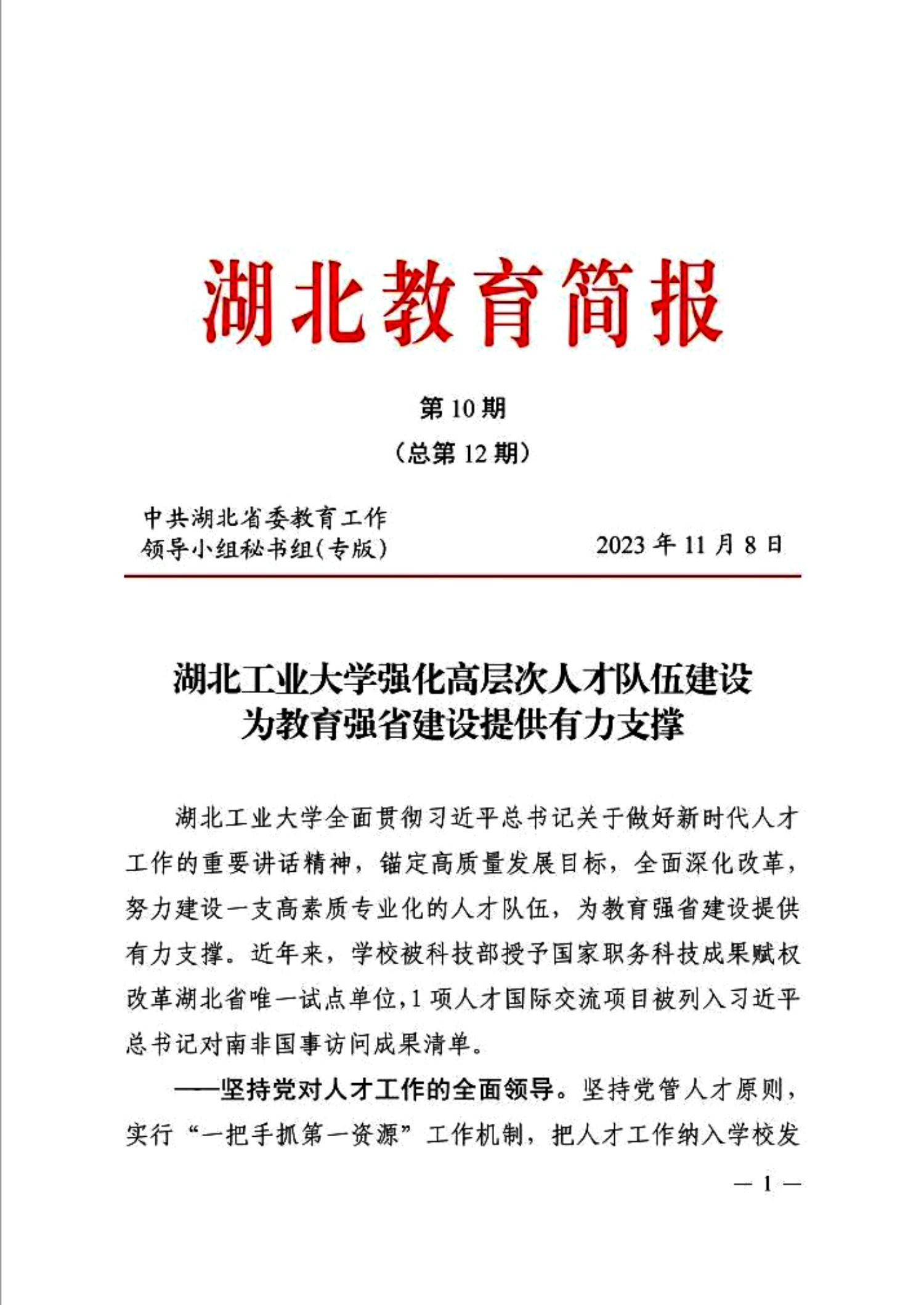 近日,由中共湖北省委教育工作领导小组主办的《湖北教育简报》第10期,以《湖北工业大学强化高层次人才队伍建设 为教育强省建设提供有力支撑》为题刊发了我校人才队伍建设改革创新举措。《湖北教育简报》主要报送中央教育工作领导小组秘书组秘书局、教育部办公厅,省委办公厅、省政府办公厅,省委教育工作领导小组成员及全省各高校。