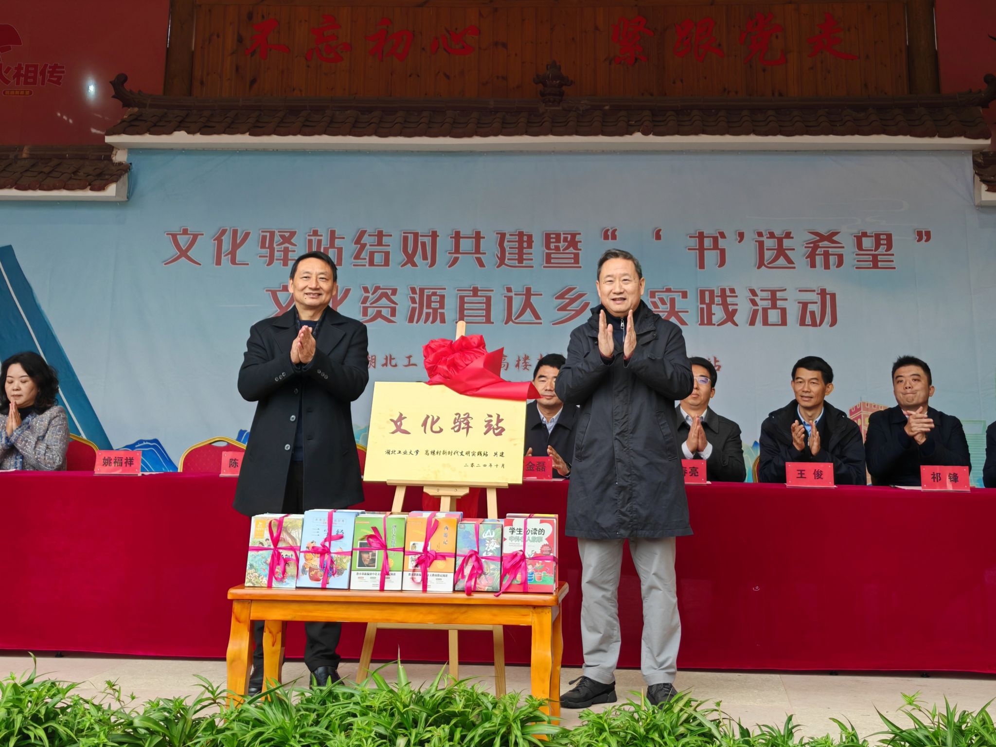 彭育园在讲话中指出,文化振兴是乡村全面振兴的重要组成部分,湖北工业大学作为文化传承与创新的重要阵地,与乡村共建文化驿站,不仅是我校展现社会价值、挖掘文化资源潜力的有益尝试,也是创新乡村文化振兴帮扶模式的积极探索,更是推动优质文化资源直达基层、惠及群众的生动实践。他表示,学校将与高楼村携手并进,以文化驿站为平台,以图书捐赠为纽带,以文化活动为载体,与乡亲“结对子”,在乡村“种文化”,共同书写乡村文化振兴的新篇章,为推进乡村全面振兴贡献智慧和力量。